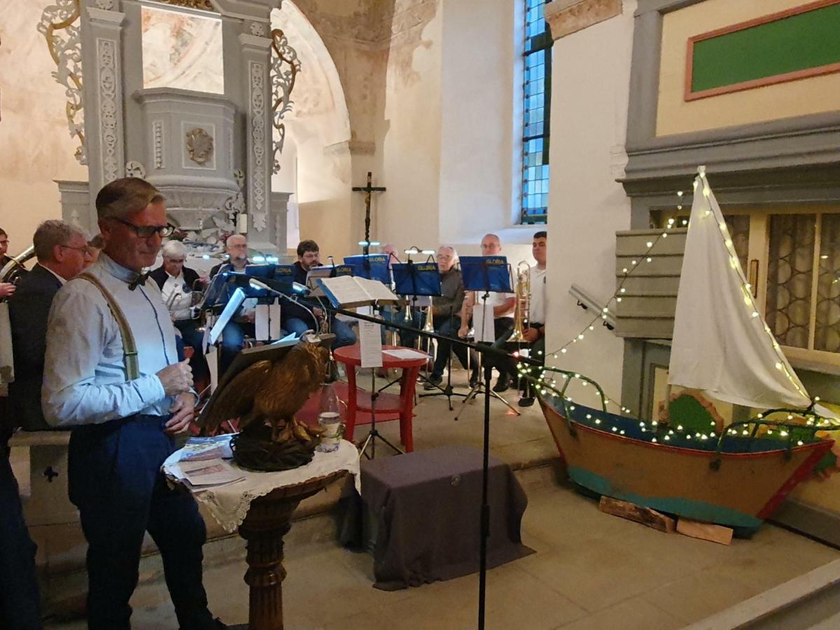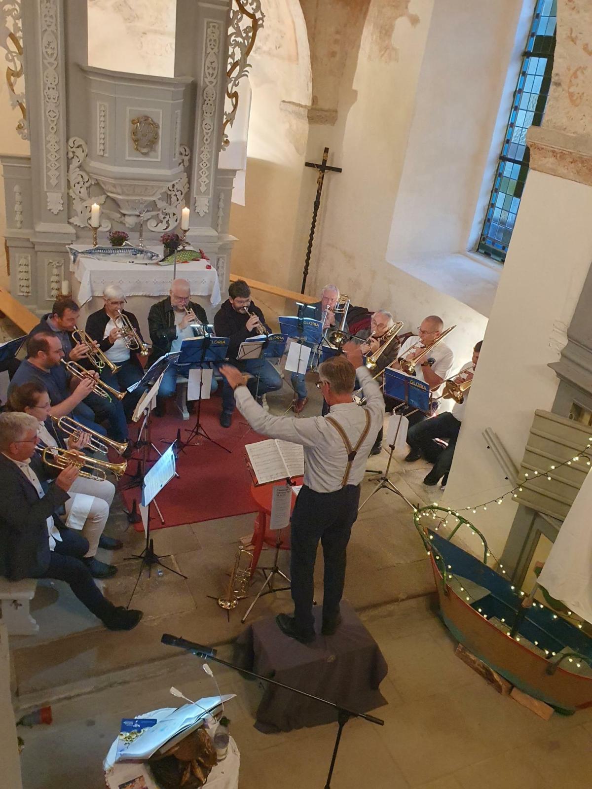 Am Samstag, dem 19. Oktober gab es in Flemmingen wieder eine Veranstaltung der Reihe "Flemminger Hauch". Der Posaunenchor der Kirchgemeinde gemeinsam mit Bläsern aus den umliegenden Gemeinden nahm uns mit Worten und Klängen mit zum Deutschen Evangelischen Posaunentag, der vom 3.-5. Mai 2024 in Hamburg stattfand. 15tausend Blechbläser konzertierten dort zur Ehre Gottes. Nach den Worten von Steffen Erler, Leiter des Flemminger Posaunenchores, Gänsehaut pur. Selbst die Gruppe dieses Abends im Verhältnis zu dem großen Treffen doch klein, mit 15 Frauen und Männern, brachte unsere Kirche St. Lucia zum Erzittern. Mit Liedern, wie "The drunken Sailor"," The Wellerman Song" oder "Ick heef mol een Hamborger Veermaster sehn", hörte, wer wollte, die Möwen im Hamburger Hafen kreischen. Und wer hätte jemals gedacht, dass einmal in unserer Kirche "Auf der Reeperbahn Nachts um halb eins" in vollen Tönen gespielt wird? Danke dafür. Und nicht nur die Ohren wurden verwöhnt, sondern auch Nase und Magen. Fischbrötchen wurden gereicht, und so kam auch noch Flair des Hamburger Fischmarktes dazu. Mit Abendliedern, Gebet, Fotos, angeregten Gesprächen und der Pflanzung eines Blauglockenbaumes im Kirchhof nahm der Abend ein heiteres Ende. Danke allen, die zu diesem Erleben für Leib und Seele beigetragen haben.