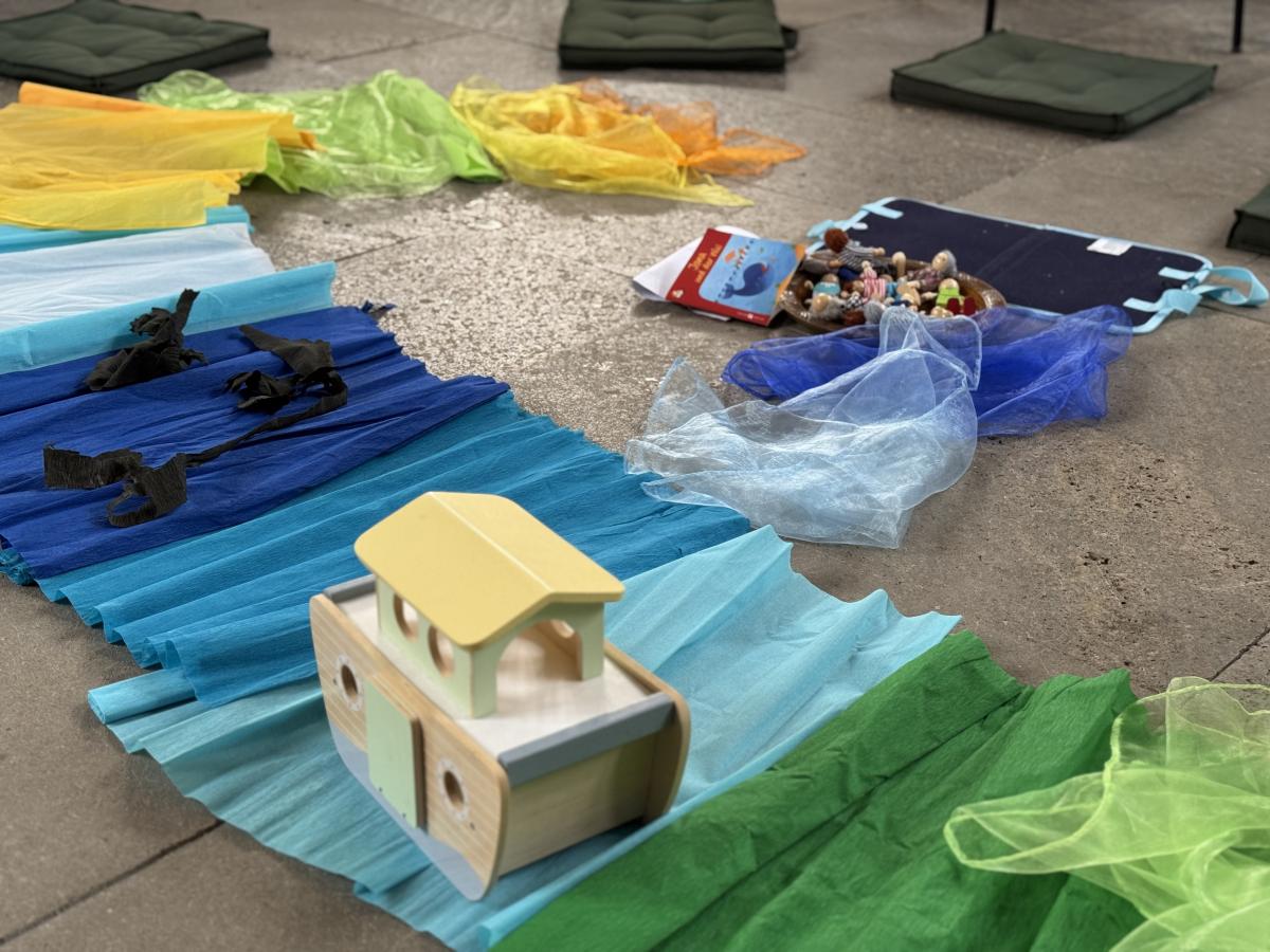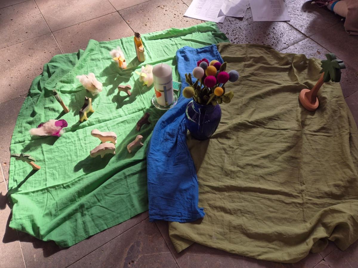 Mit liebevoll gestalteten Bodenbildern erzählten wir biblische Geschichten, die die Kinder aktiv mitgestalten und erleben konnten: durch das Spielen mit Figuren, durch Bewegung und durch kreative Aktionen. Themen wie „Jesus segnet die Kinder“, „Das Gleichnis vom verlorenen Schaf“ und „Jona und der Wal“ wurden lebendig und greifbar. Passend dazu wurde gebastelt – Kerzen, Schafe, Fische und Jona im Wal halfen, die Geschichten zu vertiefen.